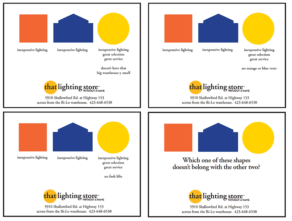 So making lemonade out lemons, we developed humorous newspaper ads and radio to promote the Grand Opening of The Lighting Store Without A Name.